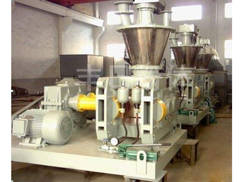 粉状物料由振动给料斗经横向螺旋送料器定量,均匀地加人轧片主料斗,使轧片主料斗内保持恒定的料粒,然后由轧片主料内的纵向锥螺旋对粉料进行预压缩并输送到两只压辊的弧形槽口,两只压辊表面均匀分布形状相同的半扁圆形弧槽或菱形槽,通过一对齿轮的啮合传动,使两只压辊等速,反向旋转,将锥螺旋输送至槽口的物料咬入槽内并瞬间强制压缩,物料经过压缩后随着压力逐渐减小在其弹力及重力作用下,从槽内脱落,进入破碎整粒系统,然后根据用户的粒度要求过筛、分级,得到符合质量要求的均匀颗粒状产品,筛下粉重新返回振动料斗循环利用。